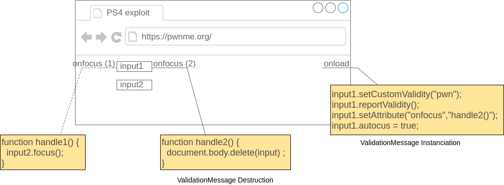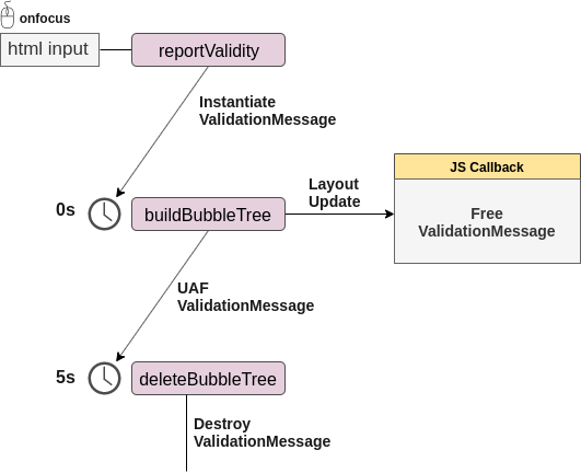 下图总结了易受攻击的路径。我们可以通过调用一些HTML输入字段上的reportValidity实例化ValidationMessage对象。我们在那个输入字段上注册一个JS处理程序。例如,我们可以定义一个JS处理程序,只要在输入字段上设置了焦点,它就会执行。