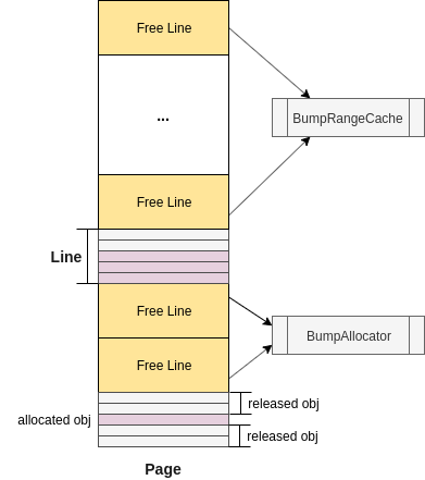 当bump分配器的可用空闲对象slots用完时,将触发fastMalloc的慢路径以重新填充bump分配器。分配器从缓存(fast path)—即bumpRangeCache—或从新分配的page(慢路径)重新填充。从缓存中获取page——即lineCache,或者从为每个块维护的空闲页面列表中获取页面。如果页面有碎片(例如,从lineCache分配的页),则连续的空闲lines用于重新填充分配器。其余的空闲lines用于填充bumpRangeCache。