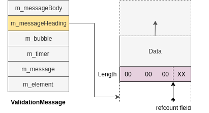 现在,如果我们正确地使用目标对象,我们最终会调用deleteBubbleTree方法,该方法将大多数ValidationMessage字段设置为空指针值。需要注意的是,在refcount类上重载空指针赋值会导致refcount递减。这意味着我们在多个受控制的ValidationMessage的字段上有一个refcount递减:m_messageBody, m_messageHeading和m_bubble。