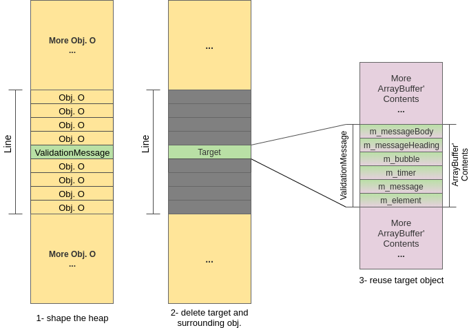 - 我们在分配目标对象之前和之后向堆中喷射对象O——其大小与ValidationMessage相同(48字节)。
