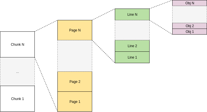 主堆由分成smallpages(4 KB)的块组成。small page为存储在smalllines(256字节)中的相同大小的对象提供分配。
