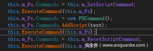 ManagedHost.RunScript() 使用 PowerShell.AddScript() 方法来添加要执行的命令,并且text 中的部分内容可控(参数部分)。这是典型的 PowerShell 代码注入漏洞,使用AddScript() 会导致在调用时对 text 里的 $ 字符进行语法解析(优先将其解析为子表达式运算符)。