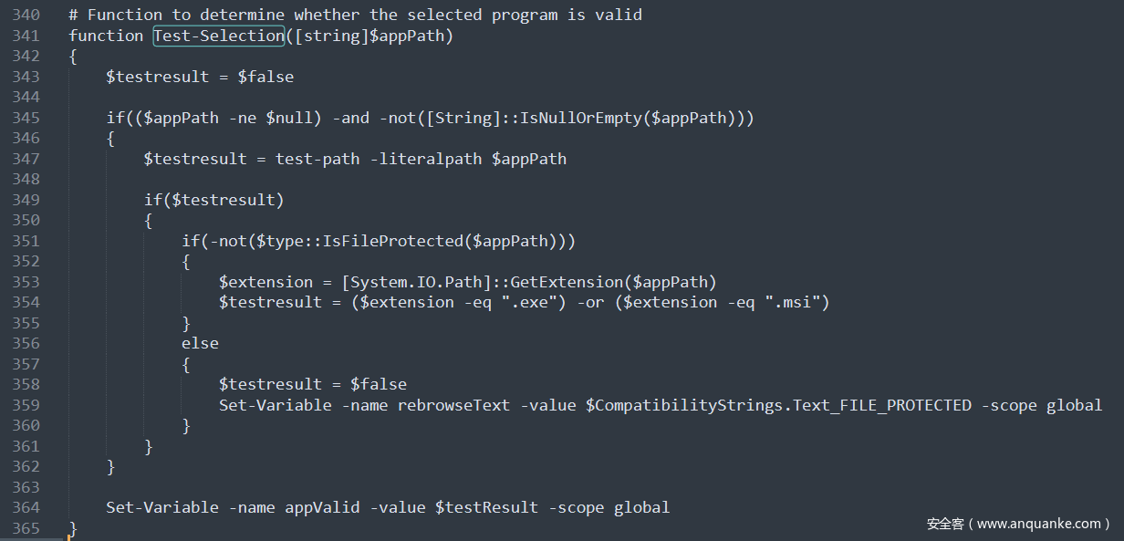 该函数首先使用 test-path 命令来对路径进行检测,以保证路径存在。然后要求路径的扩展名为 exe 或 msi。