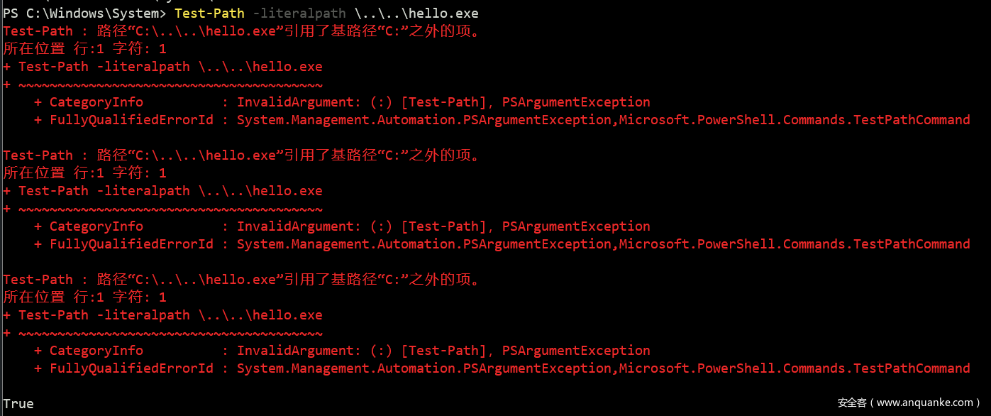 但是 test-path 对于使用 /../ 返回到根路径之外的路径会返回True,比如下面的: