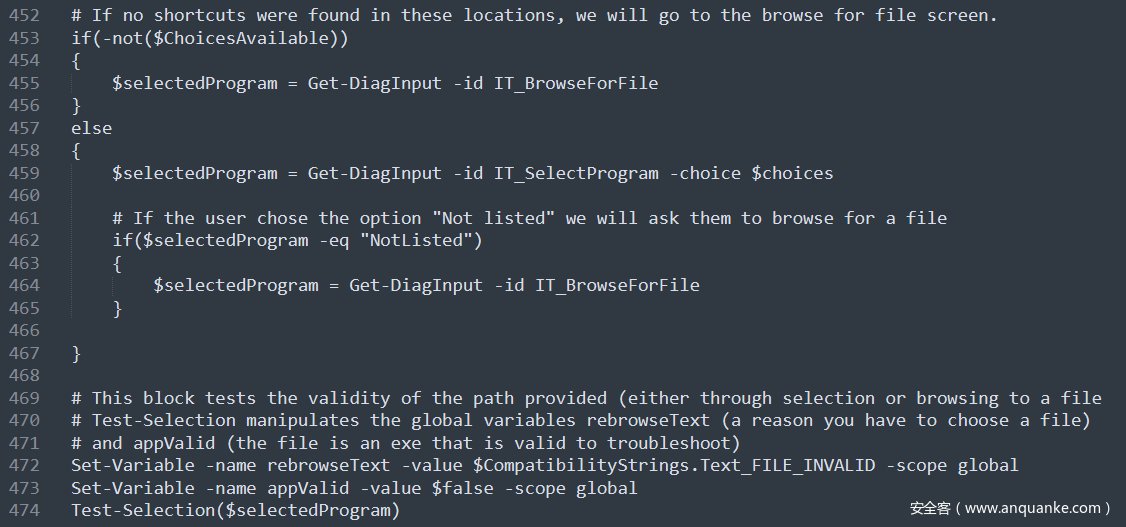 Get-DiagInput 命令就是我们前面提到的WTP PowerShell Runtime 提供的4条特殊命令之一,该命令用于从用户获取输入信息。这里获取我们传入的 IT_BrowseForFile 参数 并赋值给了 $selectedProgram 变量。