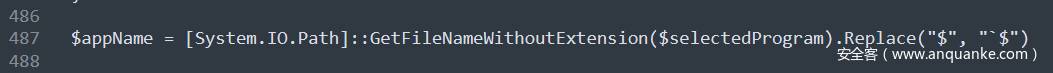 然后从 $selectedProgram 里提取文件名,并过滤$符号,以防代码注入。但这行代码其实是错的,正确的写法如下: