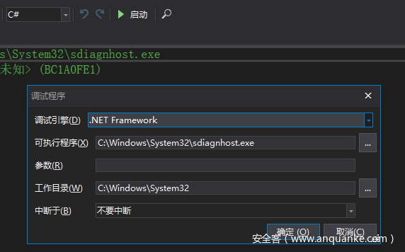 使用前面的命令触发漏洞,然后会看到 dnspy 被调用,但处于未开始调试的状态。此时需要我们手动点击上面的”启动” 来开启调试。