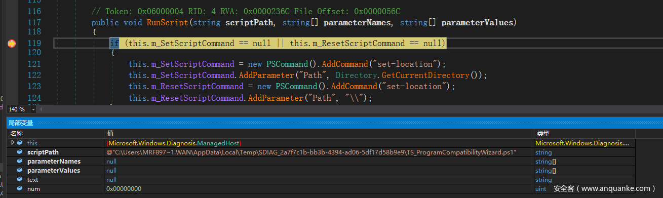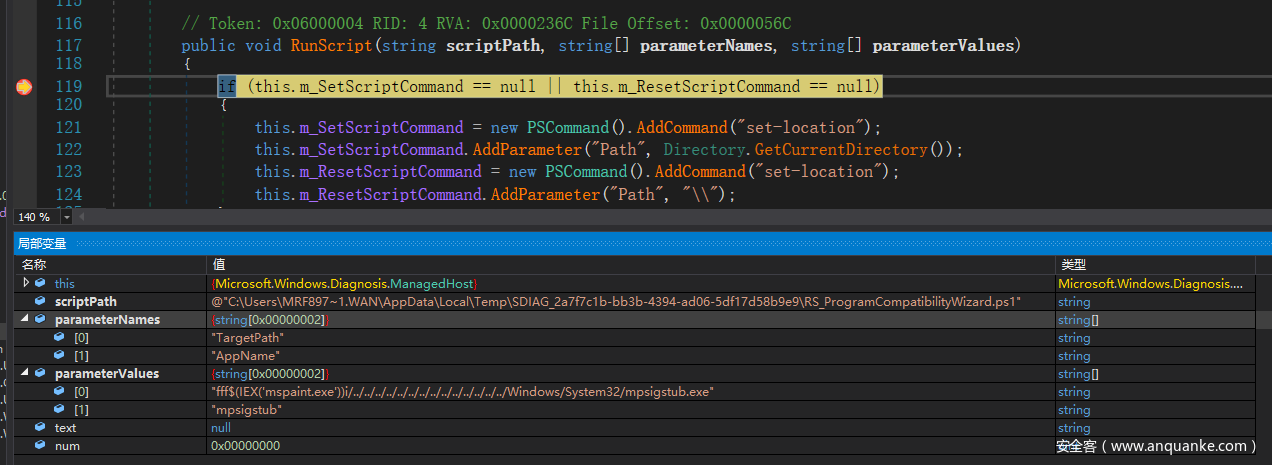 在 Microsoft.Windows.Diagnosis.SDHost.dll 里的 Microsoft.Windows.Diagnosis.ManagedHost.RunScript() 方法下断点。该方法实现了 IScriptedDiagnosticHost com接口里的 RunScript() 方法,用于给 msdt.exe 提供执行检测脚本所需的 PowerShell 运行时环境。然后重新触发漏洞,便可在此中断。