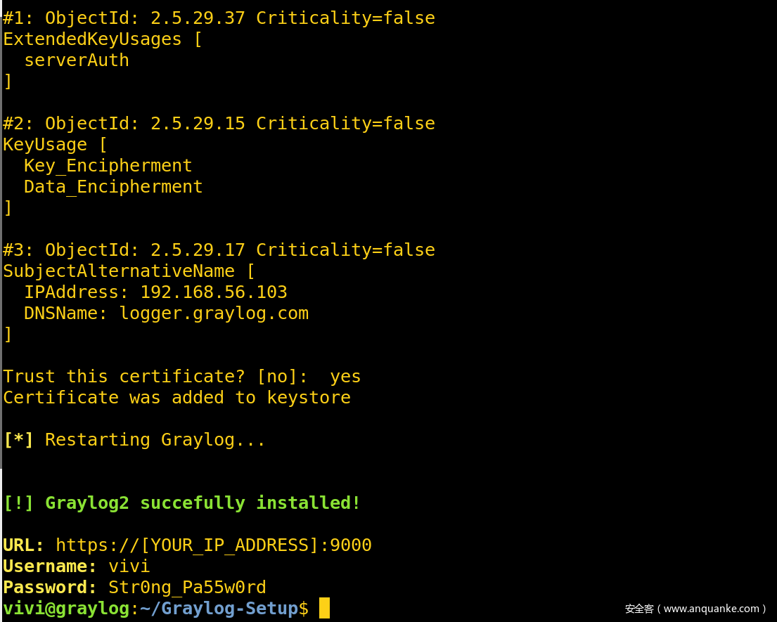 重要提示: 下一步是可选的,但我建议不要跳过它。Graylog的Web界面和REST API默认使用HTTP,这意味着您的密码和其他敏感数据以明文形式发送。下一步包括为您的Graylog安装生成并添加自签名HTTPS证书。