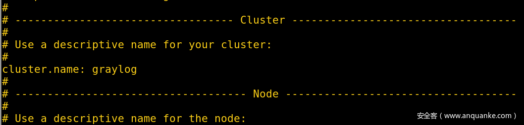 安装ElasticSearch后,您需要修改ElasticSearch配置文件(/etc/elasticsearch/elasticsearch.yml); 取消注释cluster.name设置并将其命名为graylog。