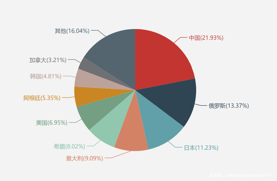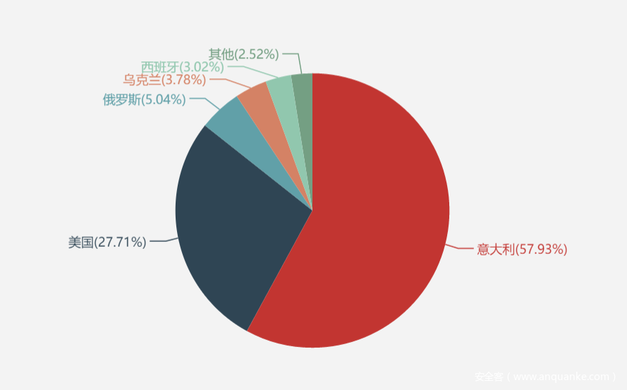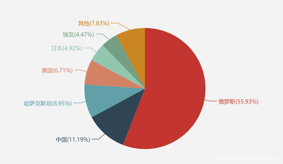 发起 NetGear 漏洞攻击最多的地区是俄罗斯,可以推断带有NetGear 漏洞扫描的病毒载体感染量大。