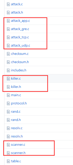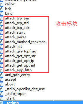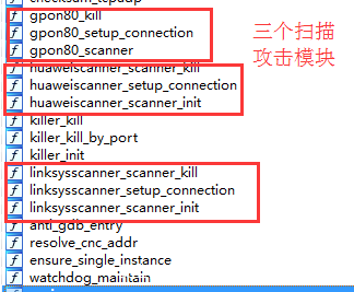 包含了攻击模块、扫描模块和结束模块三个大模块,此样本代码结构与mirai一样,只是相比增加了三种针对路由器的扫描模块。