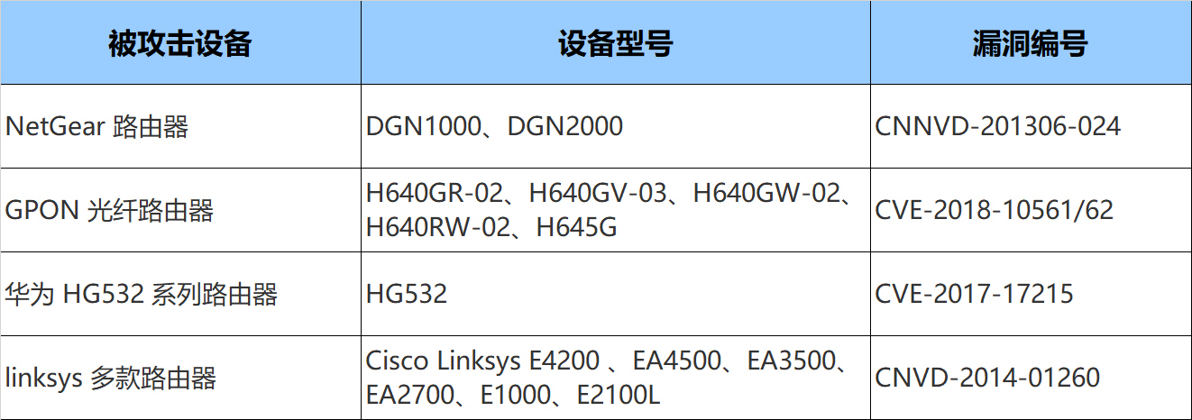 样本在传播和攻击过程中涉及到4个 PayLoad ,均针对路由器进行攻击,我们会对相关漏洞进行介绍,并针对传播情况利用抽样数据进行统计分析。