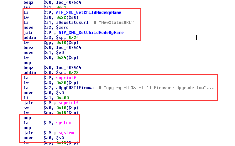 我们可以观察POC 首先提交一个身份认证信息,之后upgrade里面的NewStatusURL标签中执行了想要执行的命令。模块在upnp中,我们找到upnp模块,并找到NEwStatusURL标签,代码直接通过SYSTEM执行命令(upg -g -u %s -t ‘Firmware Upgrade….’),没有做任何过滤。
