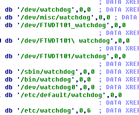 与以前的mirai不同,这里检测/dev/watchdog,/dev/misc/watchdog,/dev/FTWDT101_watchdog,/dev/FTWDT101watchdog,/dev/FTWDT101/watchdog,/sbin/watchdog,/bin/watchdog,/dev/watchdog0,/etc/default/watchdog,/etc/watchdog 等来避免重启。