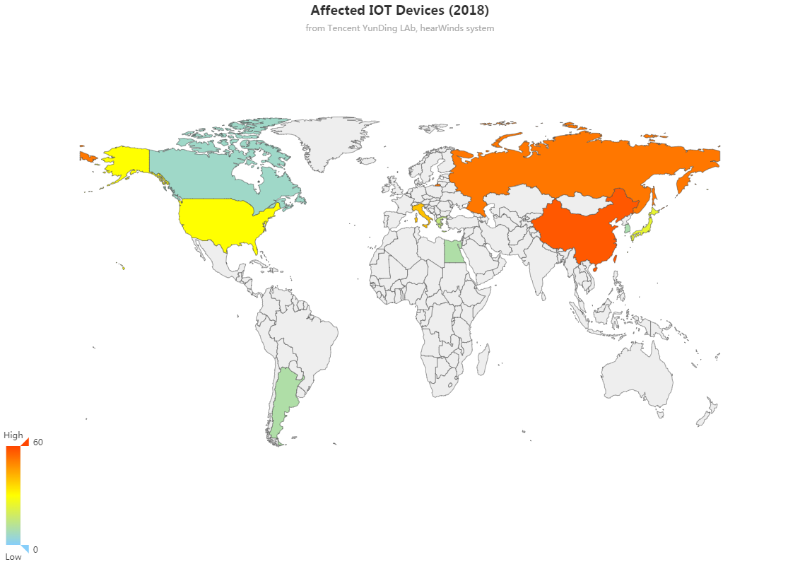 上图是几款路由器漏洞影响的国家范围,中国、俄罗斯、日本和美国是受灾较为严重的国家。与国家发展程度、网络普及程度有一定关系,也与上述几款路由器的销售区域有着较强的关联。由于国产设备多,安全性不高等原因,我国未来 IoT 安全面临着巨大的挑战。