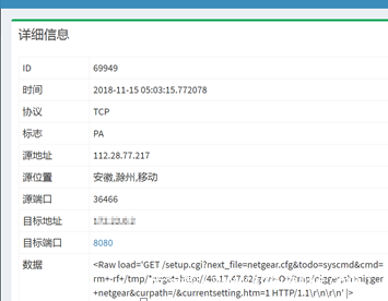 图 NetGear DGN设备远程任意命令执行漏洞攻击数据抽样统计