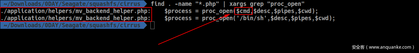 通过grep命令查找proc_open关键字后,我们在./cirrus/application/helpers/mv_backend_helper.php文件中找到了1处调用,该调用以多个动态变量作为参数。