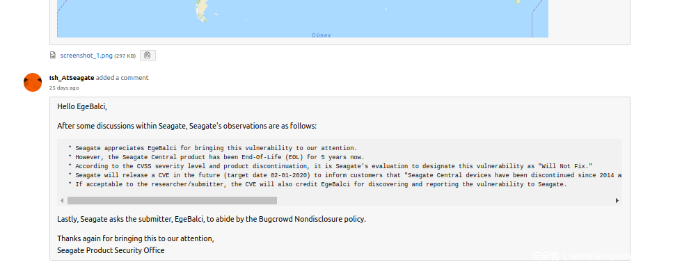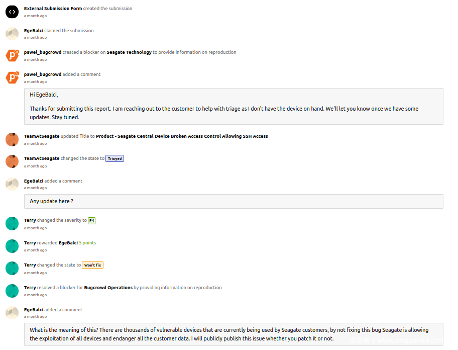 向Seagate反馈该漏洞后,对方给了我们不小的打击。Seagate一开始声称“该产品主要面向个人家庭,针对个人局域网使用”,因此实际上并不存在可用的攻击面。随后我们通过shodan.io以及censys.io找到了向互联网开放的一些目标设备,但似乎对方并不关心这个事实。既然我们不期望能拿到任何漏洞奖励或者积分,我们只能将研究成果公之于众。我们与厂商的讨论过程如下所示,之所以选择Bugcrowd平台,是因为Seagate只接收通过外部Bugcrowd表单提交的bug报告。