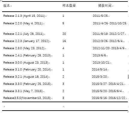 在通过深入分析解密了“Vault7(穹窿7)” 网络武器中Fluxwire后门中的版本信息后,360安全大脑将APT-C-39组织历年对我国境内目标攻击使用的版本、攻击时间和其本身捕获的样本数量进行统计归类,如下表: