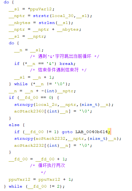 接下来循环判断’password=’后面的字符串中是否‘&’(0x26)字符,直到遇到结束符’’。这样就得到了‘password=’之后字符串的长度0x4B0=1200=len(1200*’A’),该长度是0x40B5E4处strncpy的第三个参数,