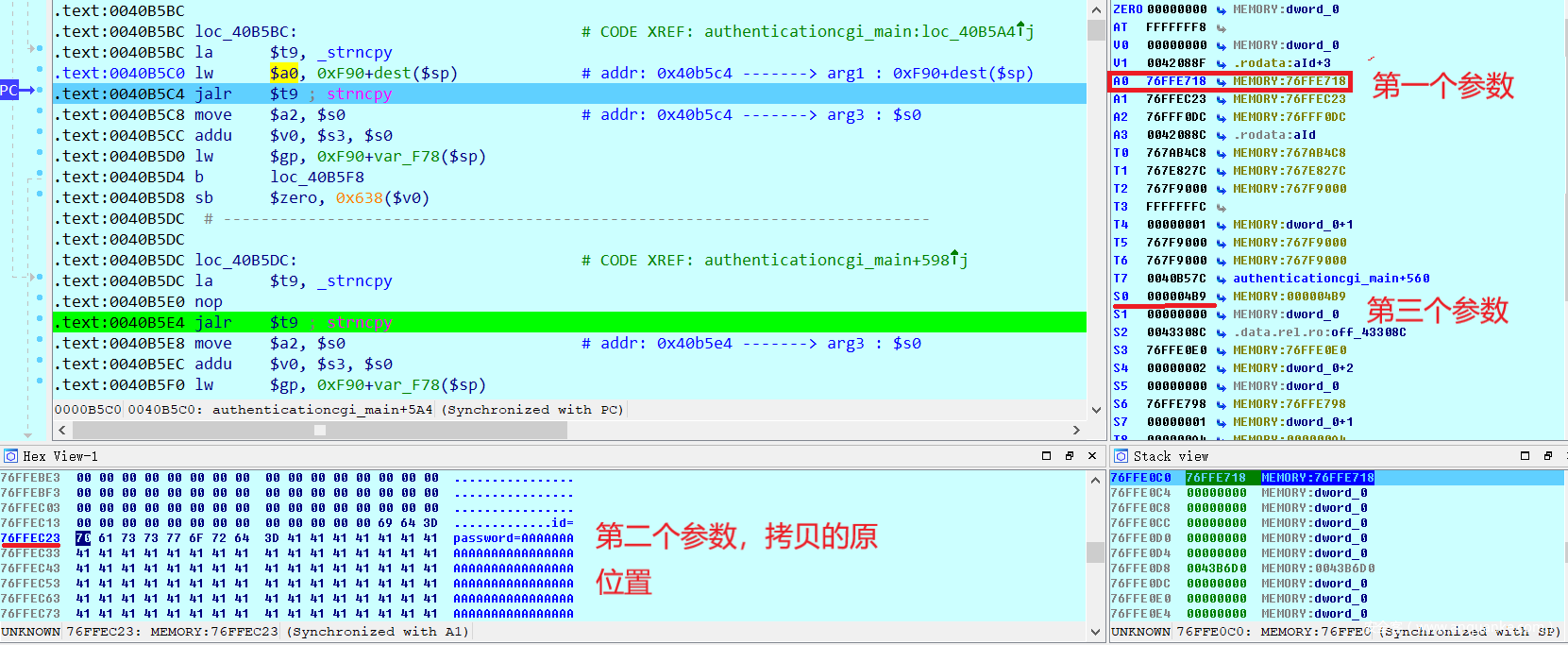strncpy(栈上地址0x76FFE798,password=’之后的内容,0x4B0)。也就是将’password=’之后的内容拷贝进0x76FFE798处。这样会覆盖之前第一次strncpy的结果。那么这里的strncpy函数也很可能是漏洞溢出点。