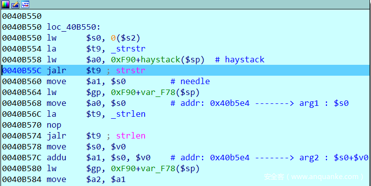 以下是调试strstr函数过程,在第一次strstr时,a1的值为s0指向‘id=’字符串,也就是通过strstr定位我们post数据中的’id=’的位置。