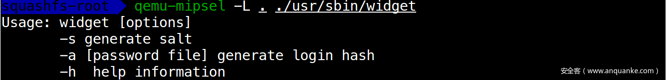 解压出来的文件系统中找不到/runtime/widgetv2/logincheck,应该是运行过程中产生的文件,根据公告提示与此关联的二进制文件是usr/bin/widget,能够利用qemu用户模式模拟执行了解其功能:-s 生成salt,-a 生成登录hash的密码文件。