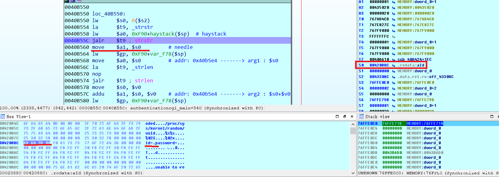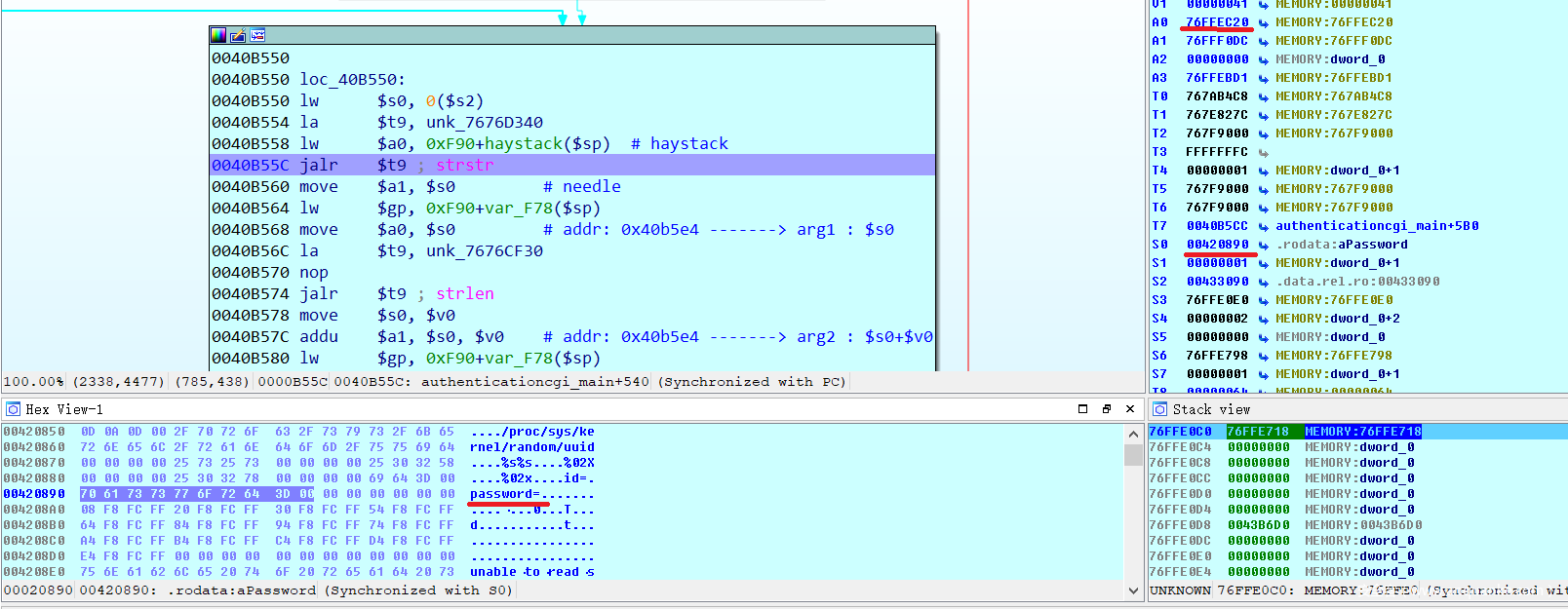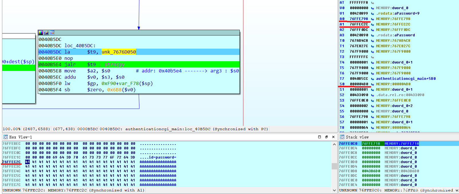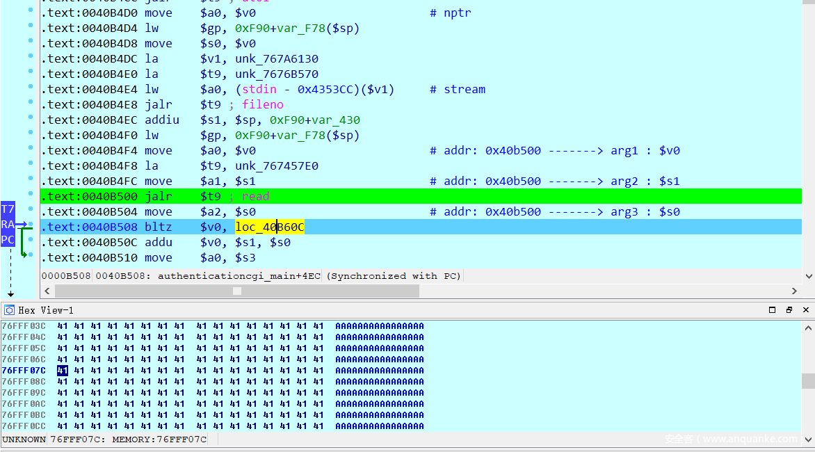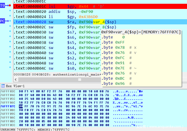 因为处理的是authentication.cgi脚本,IDA打开cgibin之后,定位到authenticationcgi_main函数在0x0040B01C,并在该处下断点,单步调试,ra存储在0x76FFF07c处,观察该处的内容何时被覆盖。