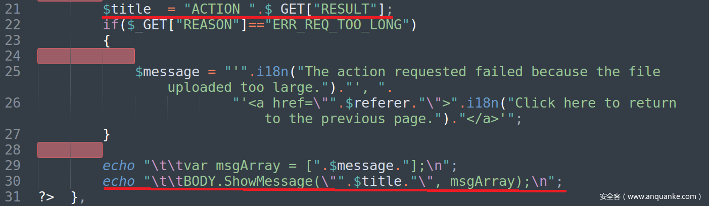 获取get表单中RESULT的内容给title,之后echo,也是XSS。可以用",msgArray);闭合ShowMessage函数,然后再alert(‘xss’),最后用//注释掉后面代码。