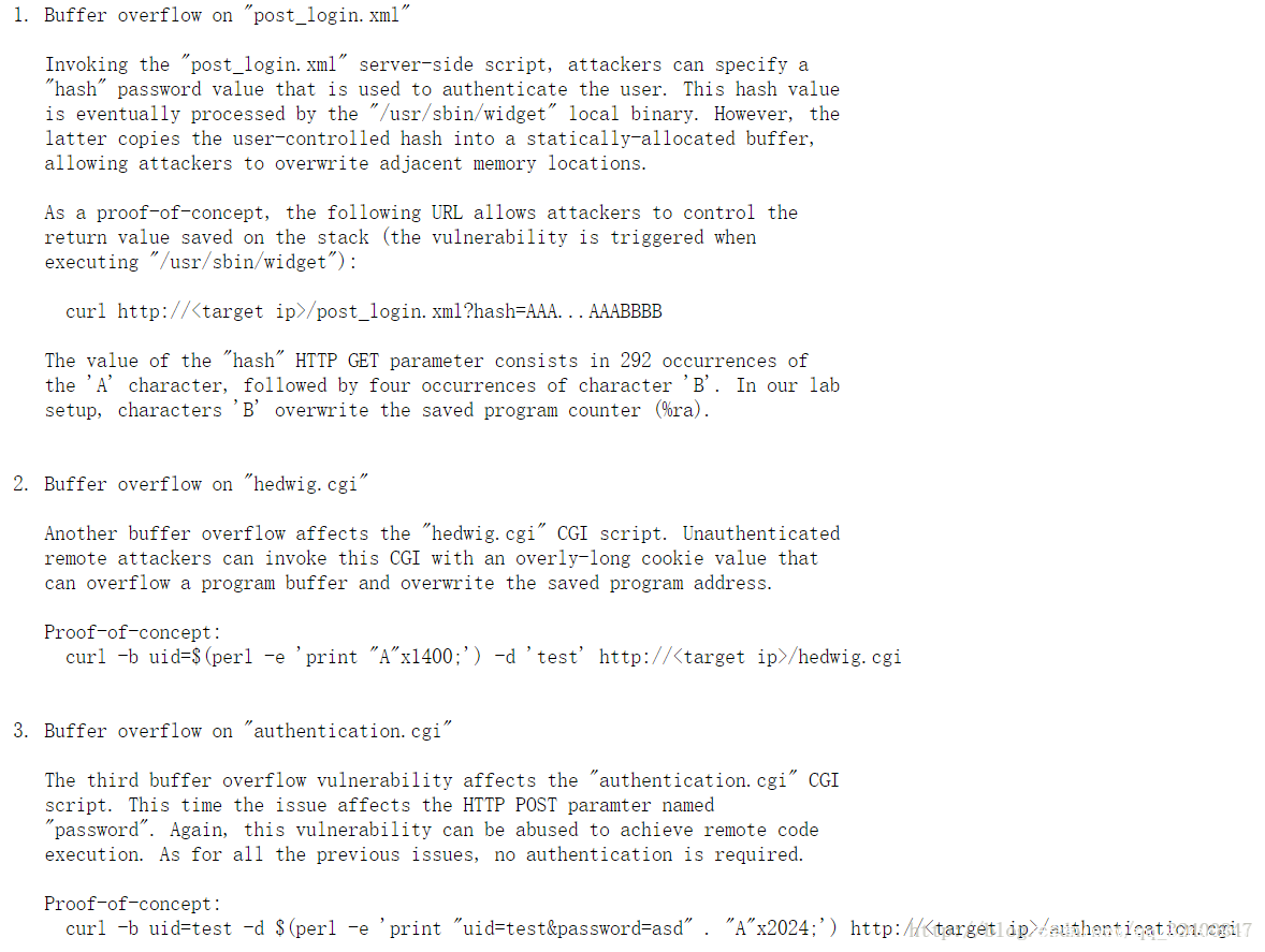 该缓冲区溢出漏洞存在于authentication. cgi脚本中,产生原因是HTTP的POST参数中password参数值过长,攻击者能够利用该漏洞在不需要身份验证条件下远程命令执行。