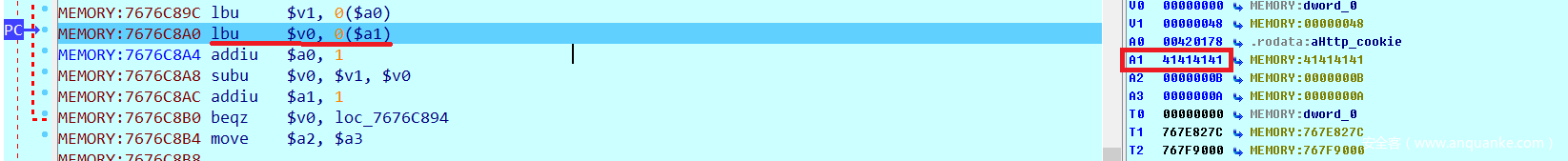 查看报错位置代码lbu $v0, 0($a1),读取a1寄存器中地址指向的数据,此时a1寄存器中值为0x41414141,无法访问该地址,这个问题应该是在运行过程中覆盖了栈上的内容,然后再赋值给a1寄存器造成的。我们尝试减小POST数据长度。