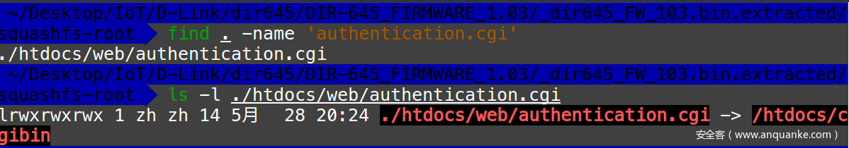 binwalk -Me解压之后,根据漏洞介绍可知,目标文件是authentication. cgi脚本,find . -name 'authentication.cgi'查找文件,并ls -l ./htdocs/web/authentication.cgi发现该cgi文件是指向./htdocs/cgibin的符号链接,真正的目标文件在cgibin中。