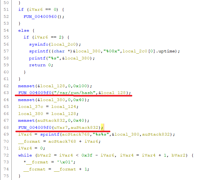 继续分析,getopt()获取了命令行参数,会进行判断,如果是-a选项,则会一直往下运行至FUN_004009f0("/var/run/hash",&local_128);