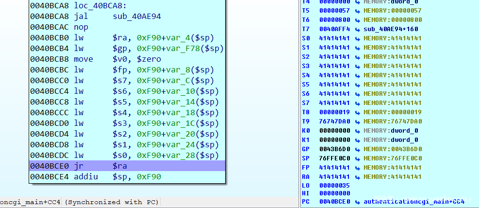 继续运行,能正常运行authenticationcgi_main函数返回值处0x40BCE0处,且ra被覆盖成了’AAAA’。