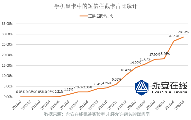 短信拦截卡这种黑卡从2018年底首次发现,由于其隐蔽性相对其他渠道更高,实际出现时间可能早于首次发现时间。2019年5月拦截卡数量出现一次增长爆发,平台聚集。得益于恶意注册市场需求的激发,拦截卡的增长速度迅猛,之后黑产持续补充相关“卡源”,使得拦截卡在手机黑卡产业中占据了自己的一席之地。