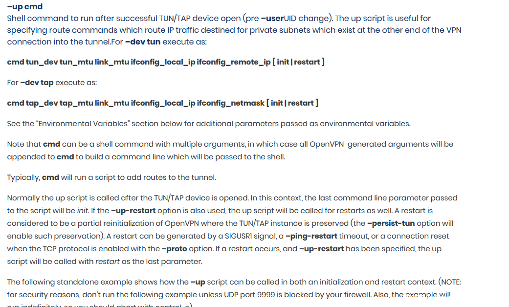 无意中看到一篇18年的老文,作者描述了一种利用OVPN文件(即OpenVpn的配置文件)创建一个反弹Shell的操作。核心在于官方声明的up命令,该命令常用于启用TUN后的指定路由。本质上相当于起了一个进程运行指向的任意脚本。
