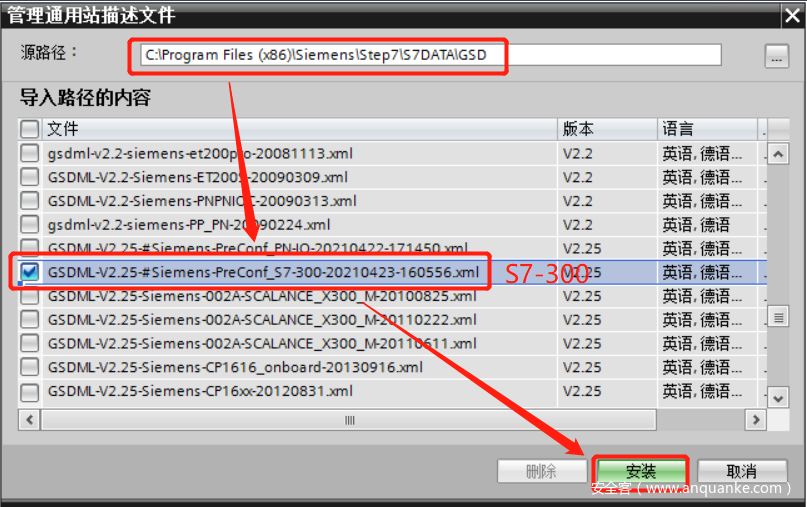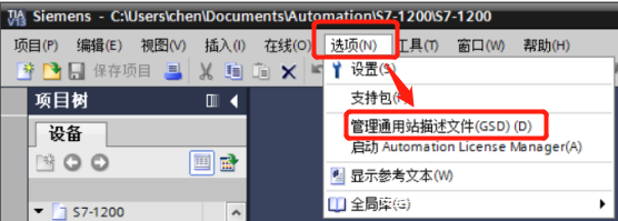 打开TIA Portal组态软件,在菜单栏中,展开“选项”,选择“管理通用站描述文件(GSD)”,在弹出的窗口中,分别找到S7-300、S7-200SMART、GA700变频器(安川)的GSD文件的源路径,安装GSD文件。以S7-300为例。