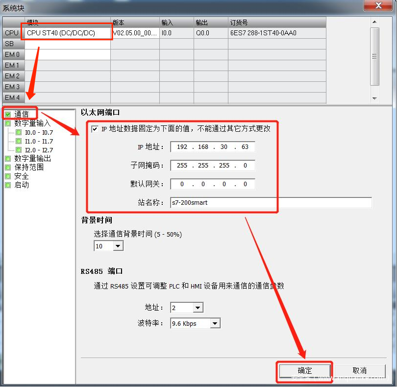使用STEP 7-MicroWIN SMART新建一个项目,选择CPU ST40,在系统块窗口通信中,设置IP地址和站名称。注意要与S7-1200 CPU的IP地址在同一个网段,且地址不能重复。