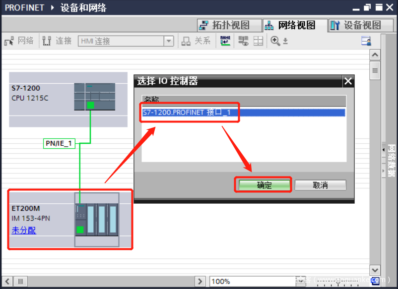 在“网络视图”中将ET200M分配给S7-1200,S7-1200作为ET200M的控制器。