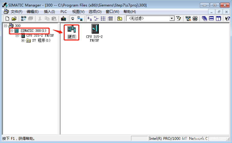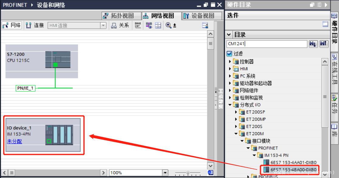 安装完成后,在硬件目录中的“其他现场设备”>“PROFINET IO”中找到已安装的IO智能设备。然后拖拉到窗口中。
