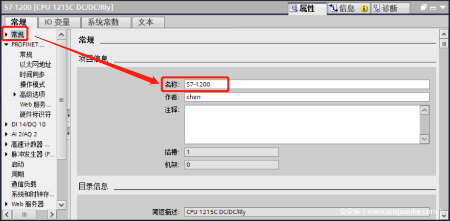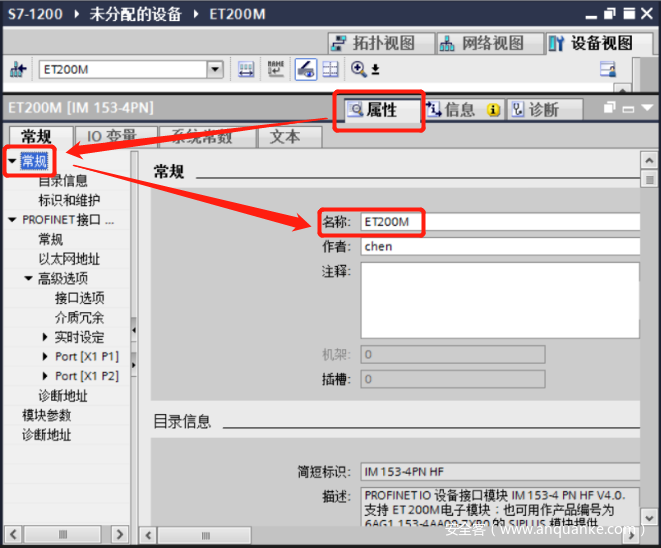在“属性”>“常规”的“名称”中修改该接口模块的设备名称(ET200M)。
