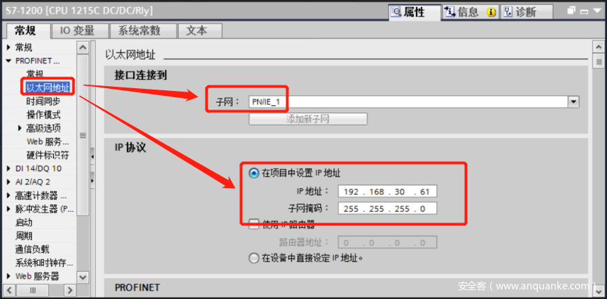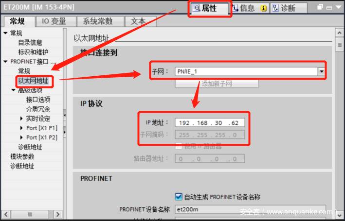在“属性”>“常规”>“以太网地址”中设置IP地址“192.168.30.62”。注意要与S7-1200 CPU的IP地址在同一个网段,且地址不能重复。