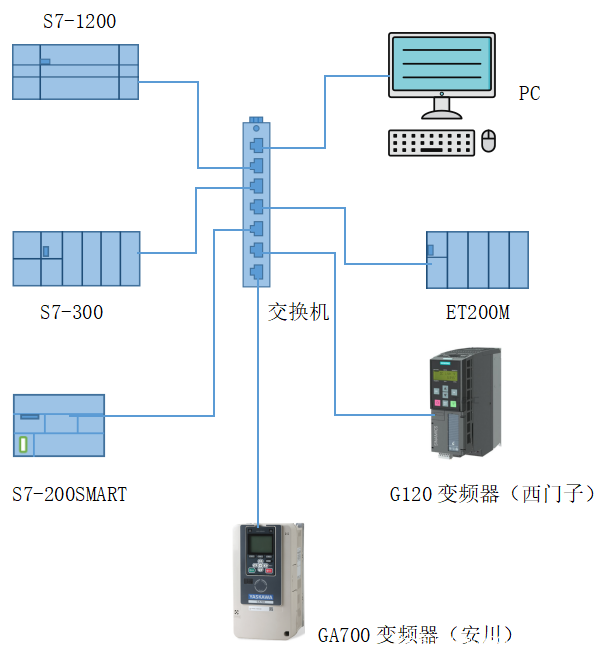 本次测试项目中,选择S7-1200为控制器,S7-300、ET200M、S7-200SMART、G120变频器(西门子)和GA700变频器(安川)为IO智能设备,网络结构如下: