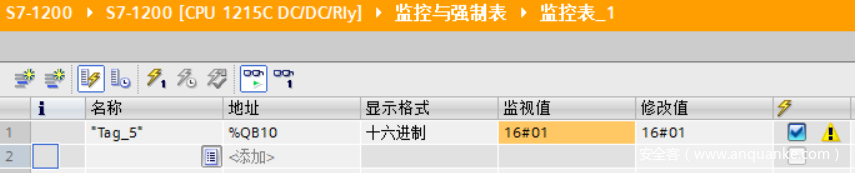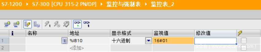 以S7-300为例。对S7-1200的QB10赋值为1,观察S7-300的IB10的值。