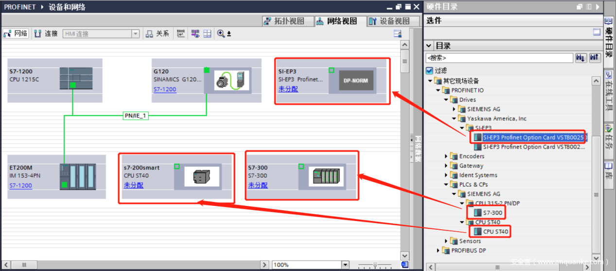 然后分配到S7-1200。经过上述的操作,在项目的网络视图中得到完整的网络结构。