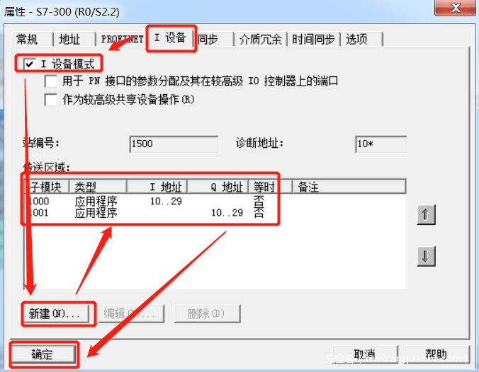 然后在属性窗口“I设备”选项中,勾选“I设备模式”,新建传送区域,注意,地址不能冲突。
