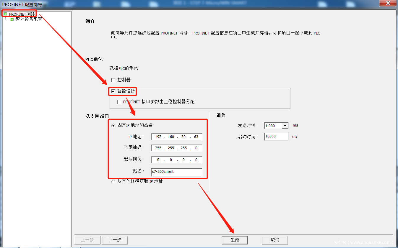 在项目树窗口中,展开项目>向导,双击打开“PROFINET”,勾选PLC角色为“智能设备”,以太网端口选择固定IP地址及站名。